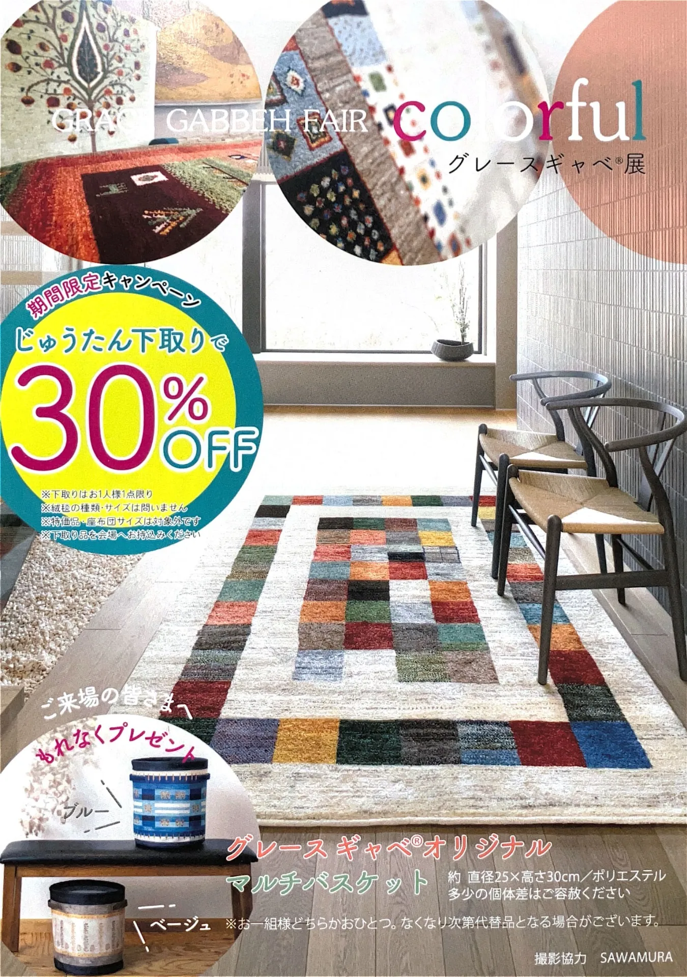 会場へ絨毯をお持ち込みいただくと、対象商品の購入金額から30%OFFになります。